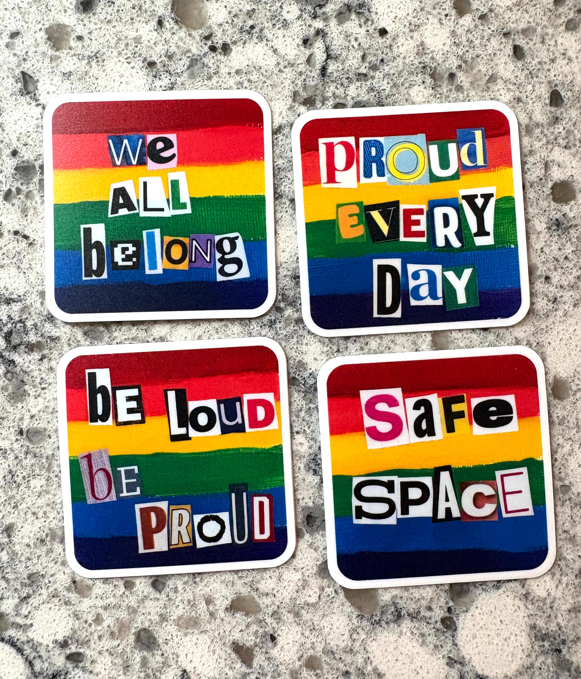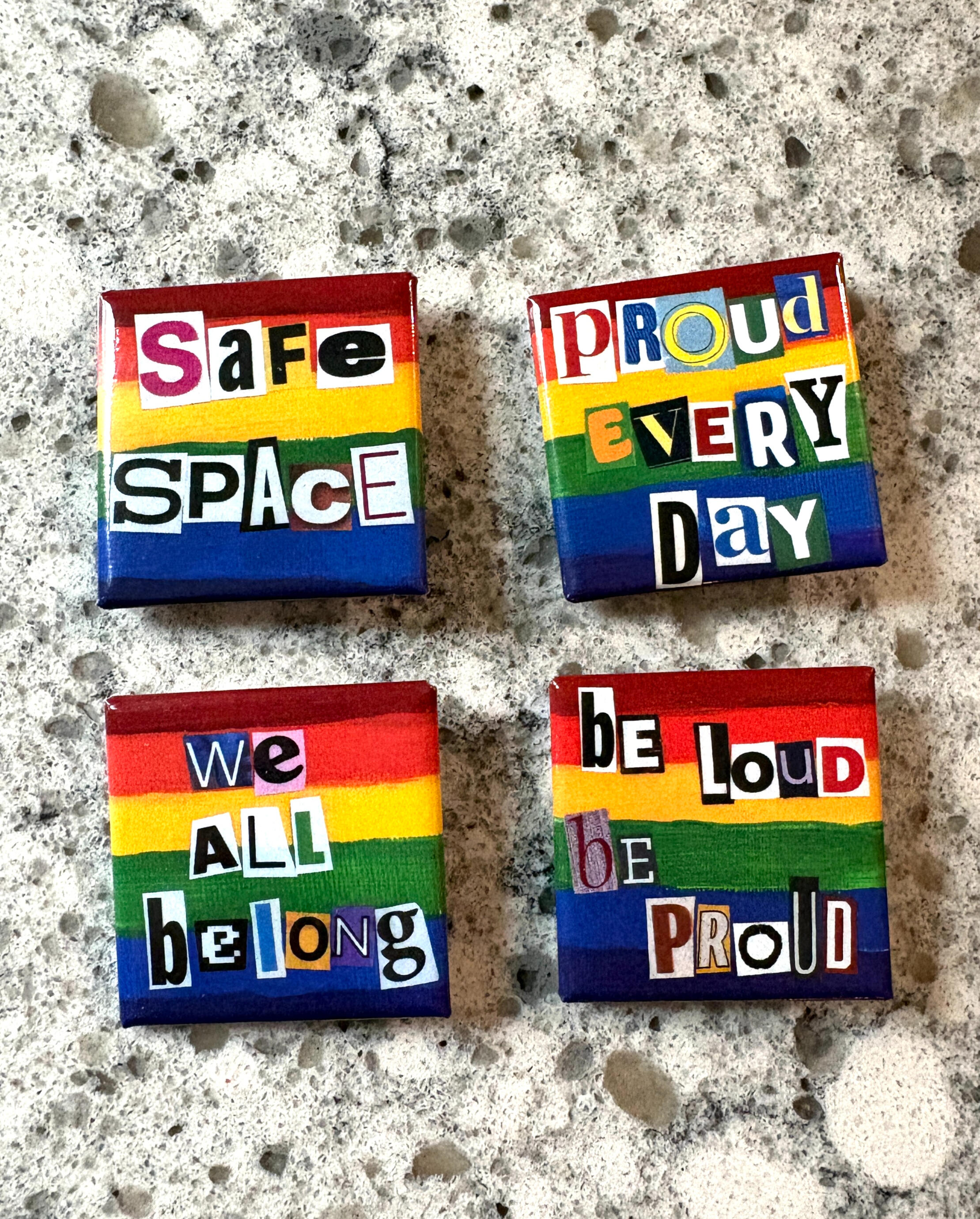 These high quality 1.5" x 1.5" buttons are made from digital versions of our hand painted magnets. They stand out from other buttons out there in their unique, edgy collage letters. You can even see the texture of the original canvas, which adds dimension and depth. 4 sayings available: Be Loud Be Proud, Safe Space, We all Belong, and Proud Every Day. These are a perfect, visible demonstration of your pride and/or allyship.