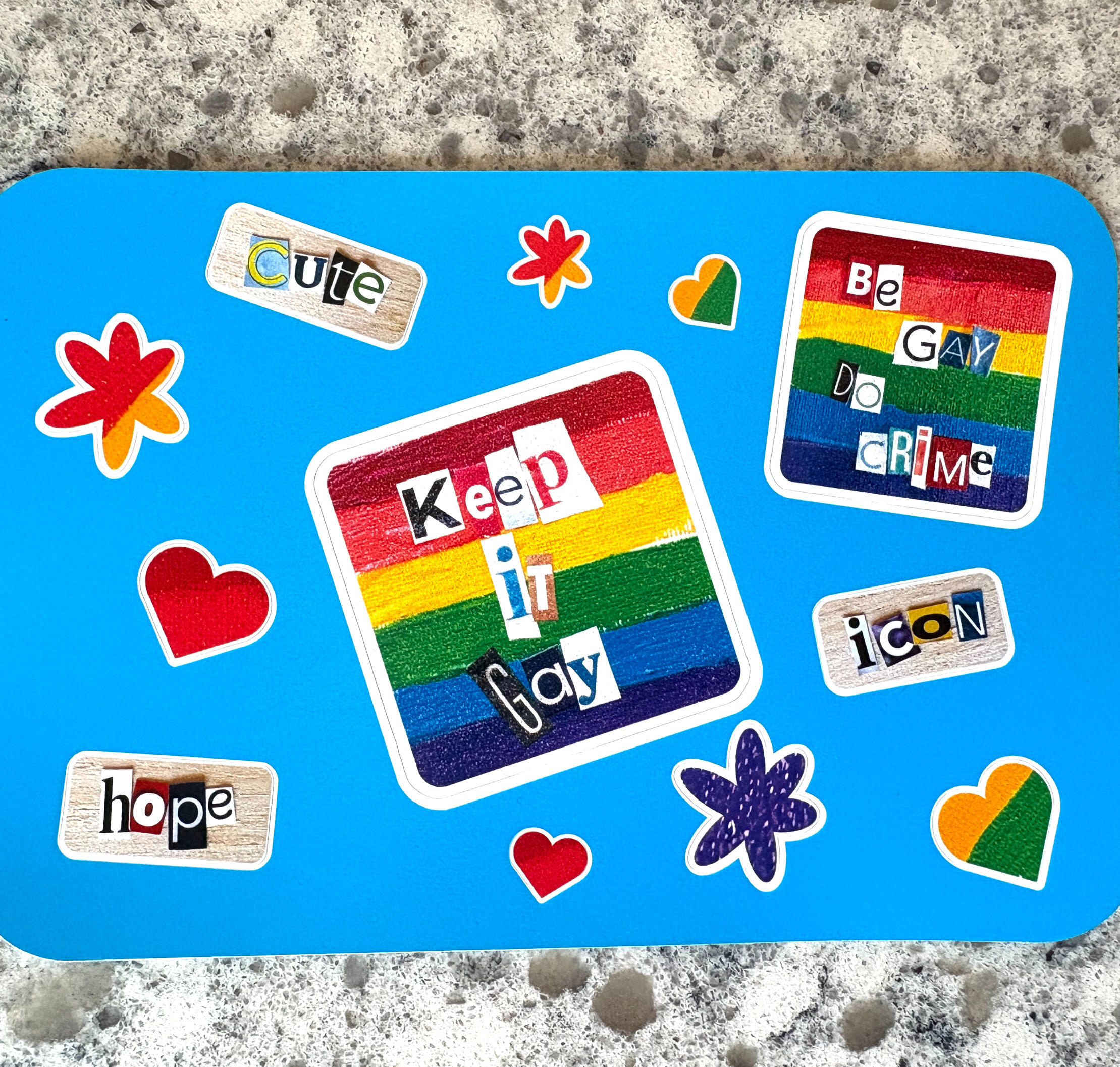 At 4" x 6" these stickers sheets are packed with goodness! the center sticker "Keep it Gay" is approximately 2" x 2", and the rest range in size. These are a fun way to decorate laptops, water bottles, use in journalling, and have a variety of other uses. Each contains 12 stickers in total to ensure there are lots to go around.