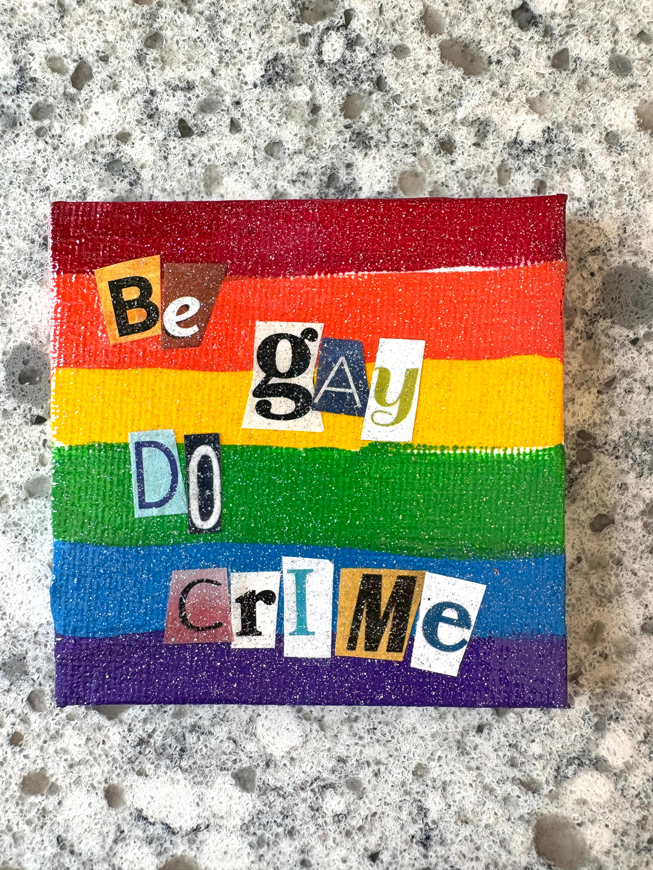 These 3" x 3" hand painted magnets come in a variety of phrases: Be Gay Do Crime, Resist Rest Repeat, Be Loud Be Proud, Sounds Gay I'm in, Safe Space, We all Belong, Proud Every Day, and Cute but Chaotic. Each one is a unique creation as every flag is painted and lettered by hand.